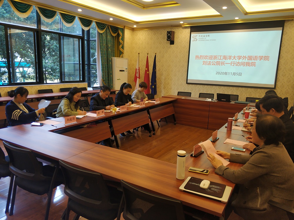 2020年11月5日下午,浙江海洋大学金沙39159游艺场官网经理刘法公教授一行5人到金沙39159游艺场官网开展调研与交流工作。金沙39159游艺场官网经理王小潞教授、党委副书记(主持工作)兼副经理傅晓宇、副经理蔡亮、副经理周汶、外国语言研究所副所长陈俊林和日语专业负责人邓凌志等在SC106波兰研究中心热情接待了兄弟院校的来访,会议由蔡亮主持。