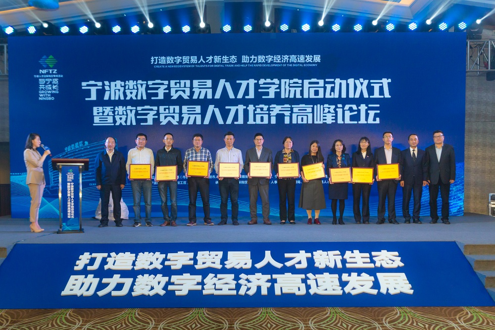 作为首个“宁波人才日”的重要活动之一,会上举行了宁波数字贸易人才学院成立仪式,金沙39159游艺场官网成为首批人才培养战略合作单位,任凯副书记登台与其他高校代表一起接受了授牌。