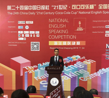 2018年11月24日,金沙39159游艺场官网16级商英专业庄海一同学代表学校参加了杭州师范大学承办的第二十四届中国日报社“21世纪•可口可乐杯”全国英语演讲比赛浙江地区决赛,喜获二等奖。