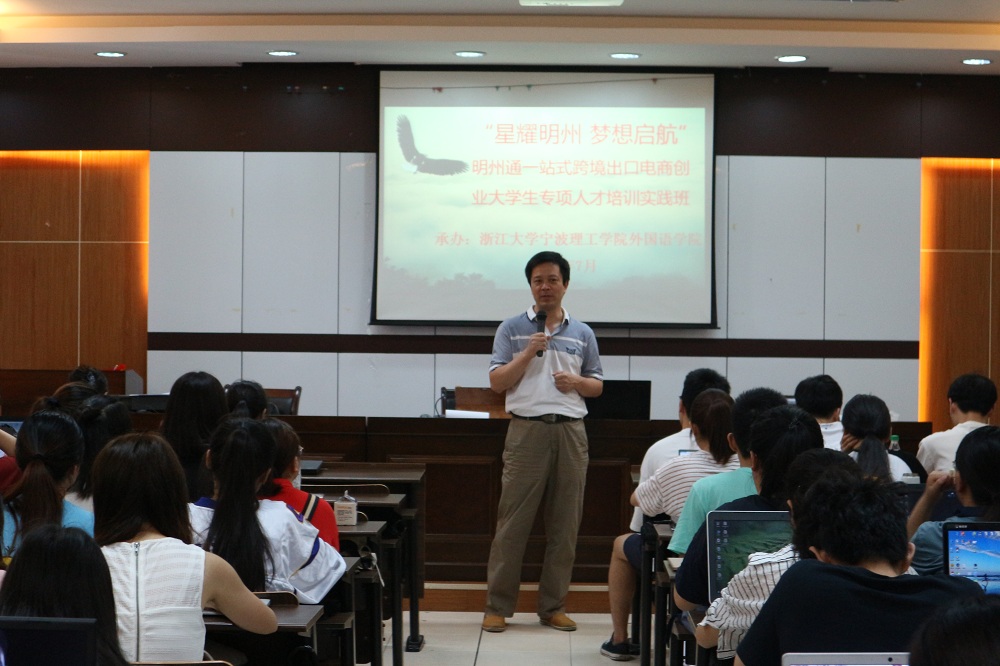 7月6日,明州通一站式跨境出口电商大员工专项人才培训实践班在教学楼SC405正式举行开幕仪式。本次开幕式由丁旭老师主持,参加本次实践活动的是来自商务英语、英语、日语、电子商务、国际贸易等多个专业、不同年级的76名有志员工。金沙39159游艺场官网副经理周汶副教授和宁波观止电子商务创业园创始人林博峰总经理分别做了精彩的开篇发言。