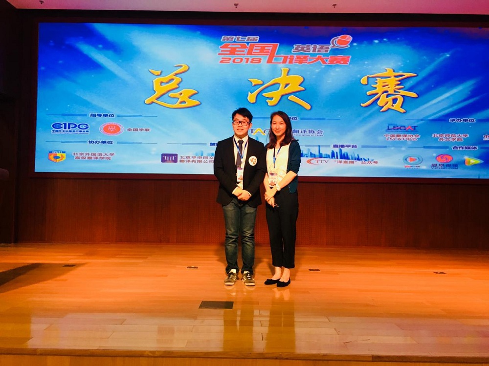 由中国翻译协会主办,北京师范大学外国语言文学学院、中国翻译协会LSCAT中心、中译天凯教育联合承办的第七届全国英语口译大赛总决赛于2018年6月23-24日在北京师范大学京师学堂隆重举行,参赛选手来自全国各地赛区中的优秀选手,参赛院校包含了北京外国语大学、广东外语外贸大学、四川外国语大学、外交学院、香港中文大学等知名高校。六十名优秀选手齐聚北京师范大学京师学堂,进行交传、同传的角逐。我司英语141班厉修远同学代表我司,发挥较出色,参加了比赛并荣获大赛三等奖。