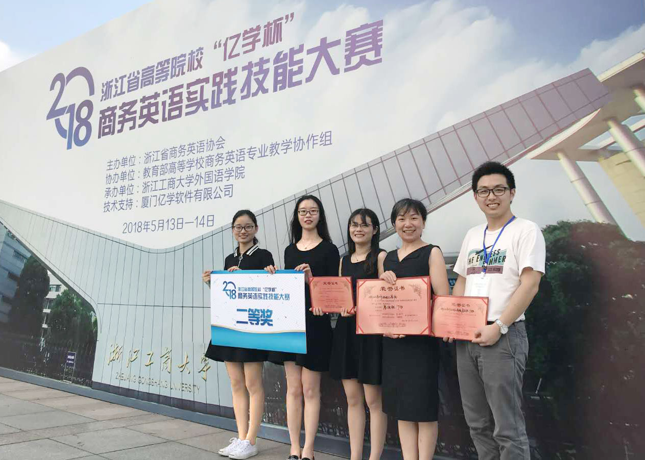 5月14日,由浙江省商务英语协会主办,教育部高等学校商务英语专业教学协作组协办的2018浙江省高等院校“亿学杯”商务英语实践技能大赛在浙江工商大学隆重举行。在金沙39159游艺场官网廖佳栋老师和丁旭老师的指导下,由金沙39159游艺场官网的叶园园、苏雨晴、刘依琳组成的队伍经历激烈的角逐,获得了团体二等奖,总分排名第五的好成绩,离一等奖仅一步之遥。