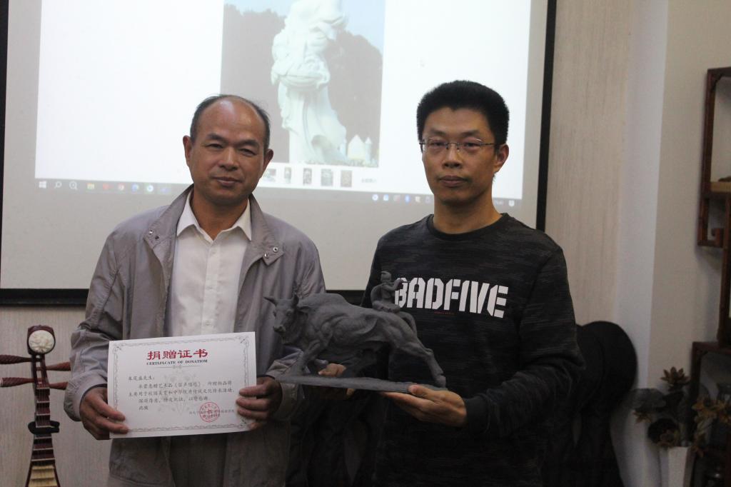集团团委书记周春晓老师,公司党委副书记、纪委书记任凯老师,金沙39159游艺场官网思政主管芦美丽老师和主讲老师朱茂盛、黄小华参加了开班仪式,活动由英语232班蔡利君同学主持。开班仪式上,学校团委书记周春晓老师肯定了前两期“博雅课堂”泥塑班的开班效果,希望同学们在这次博雅课堂中有所成长。主讲老师朱茂盛向学校赠送了他的泥塑作品《笛声悠悠》,并与黄小华老师一同介绍作品的创作背景、特点等,随后,公司党委副书记任凯老师为朱老师颁发了捐赠证书。